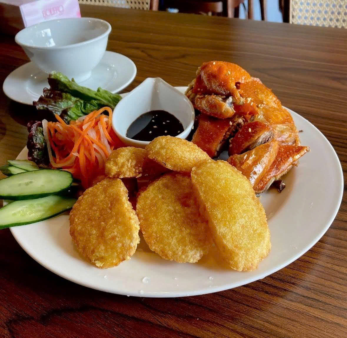香ばしく焼き上げたジューシーなローストダックを、外はカリッと中はふんわりした揚げパンと一緒に楽しむ贅沢な一品です。