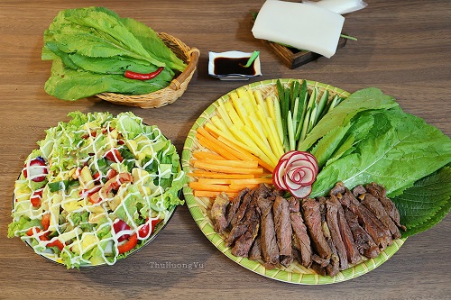 新鮮な野菜の葉でジューシーな牛肉を包んだ、ヘルシーで美味しいベトナム料理です。