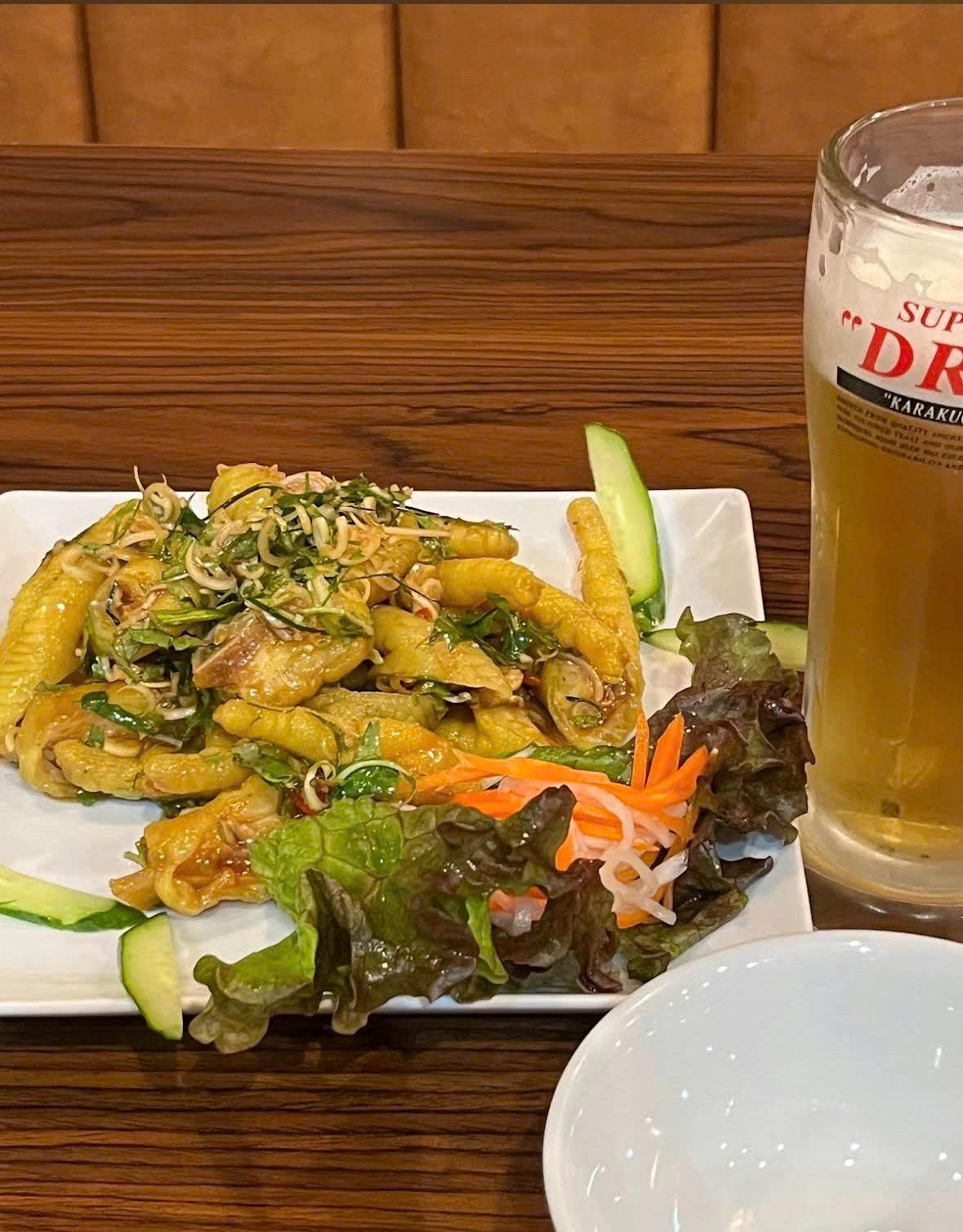 新鮮な鶏足を特製ソースで和え、野菜やハーブと組み合わせた、酸味と辛味のある風味豊かな一品です。
